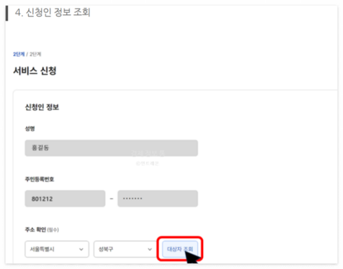 본인의 이름, 주민등록번호, 거주지 주소를 확인하고 대상자 조회를 진행합니다. 간편 인증을 사용하지 않은 경우 추가로 휴대폰 번호 인증 절차가 필요합니다.