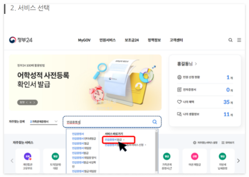 로그인 후 검색창에 '인감증명서'를 입력한 뒤, 서비스 바로가기를 클릭해 인감증명서 발급을 선택합니다.